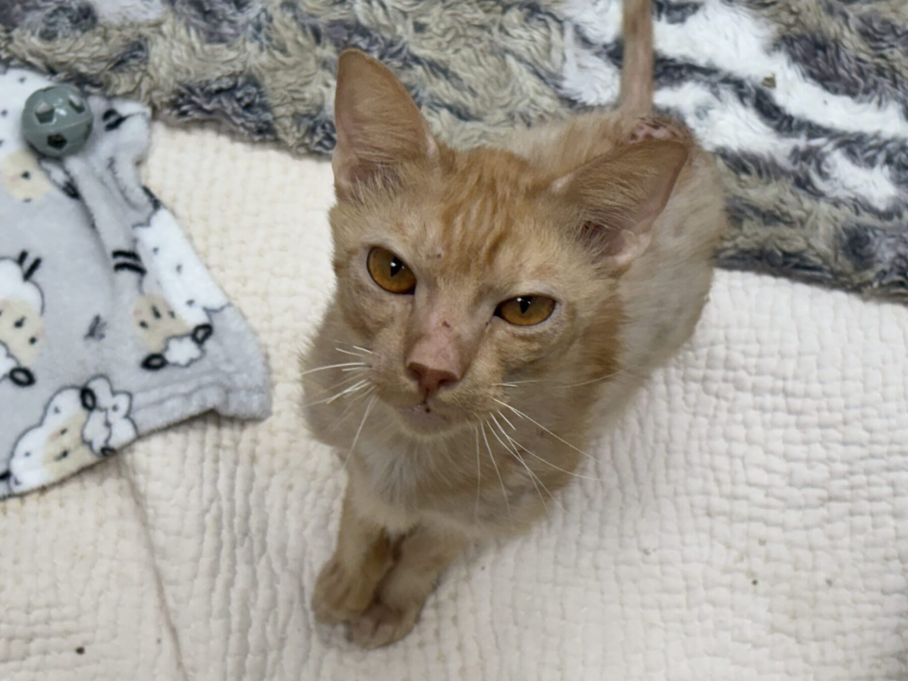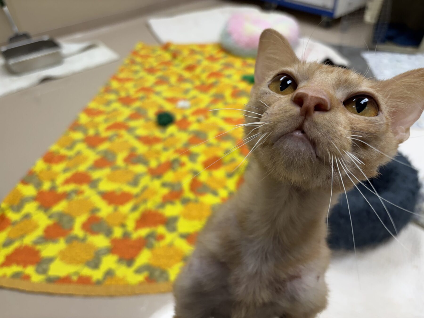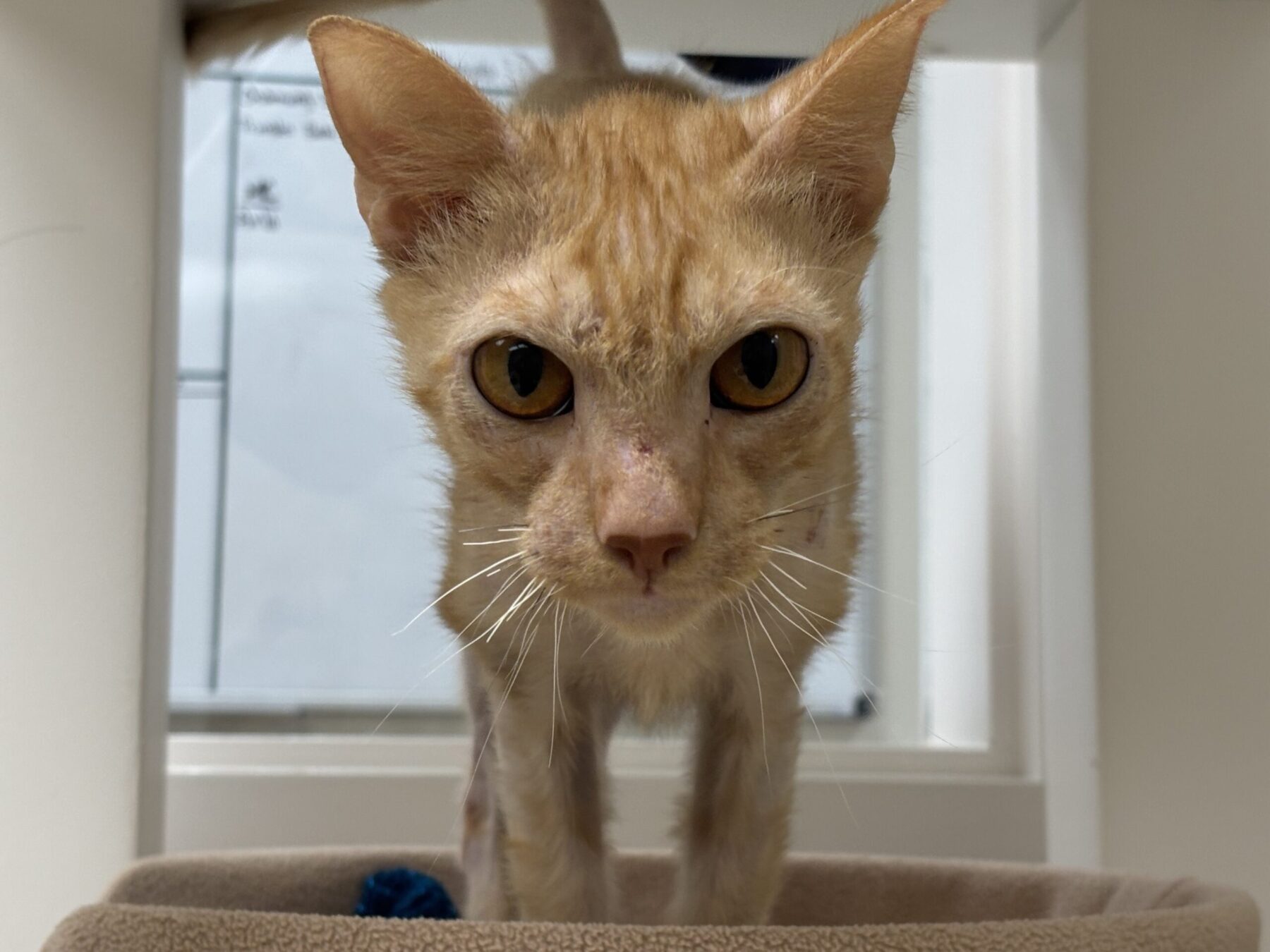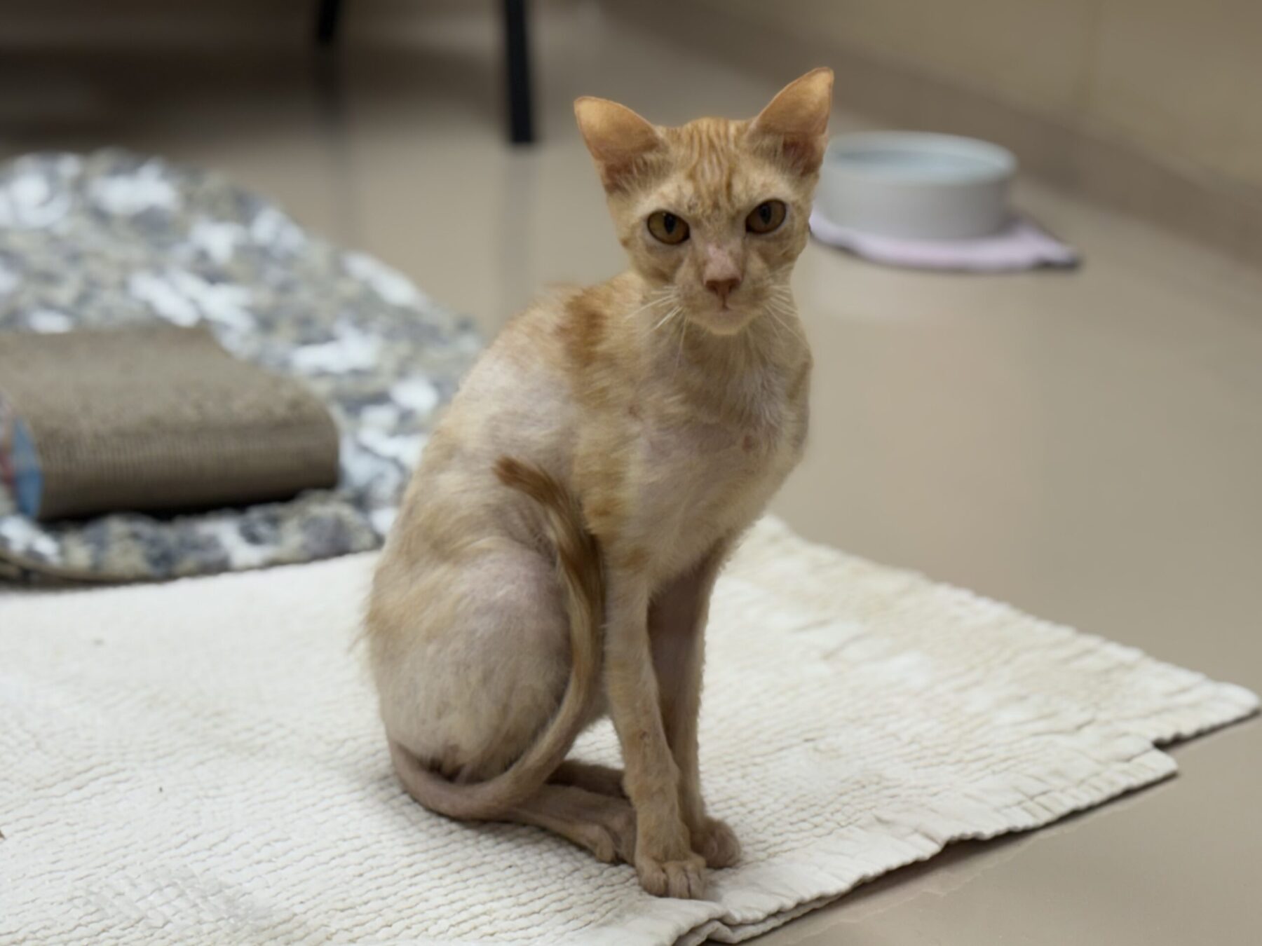 As you can see, I may look like a hairless cat, but I’m really an orange tabby! The doctor says I have something called allergies, and we’re still testing out different foods and medications to help me feel my best.
